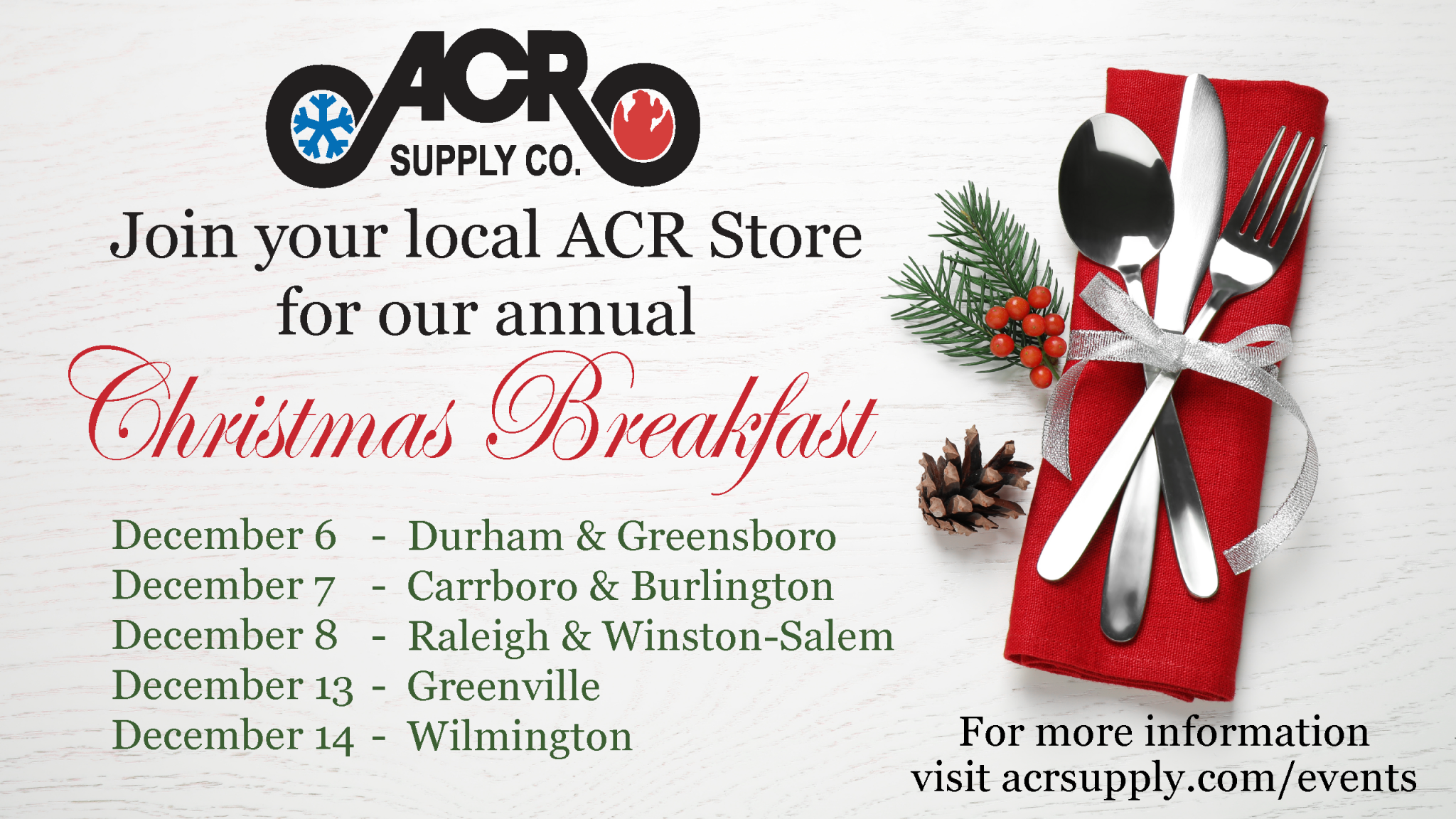 Join us for our Annual Christmas Breakfast at all of our ACR Store Locations! Visit our events page for more information!